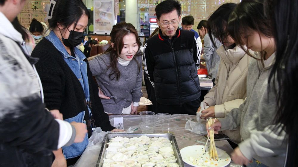 同学们分成九个小组,九个小组的组长将一颗“惊喜”糖果巧妙地包入饺子中,吃到“惊喜”的同学将获得精美礼品一份。老师们也加入了包饺子的行列,师生欢聚一堂,各展所长,形态各异、白白胖胖的饺子接连不断地摆上了餐桌。从元宝形状到月牙形状,各式各样的饺子装点着餐桌,看着这些独具特色的饺子,师生们 开始讨论起南方与北方包饺子的差异,零基础的小伙伴也悄悄地向身边的人请教,希望能尽快掌握包饺子的技巧。