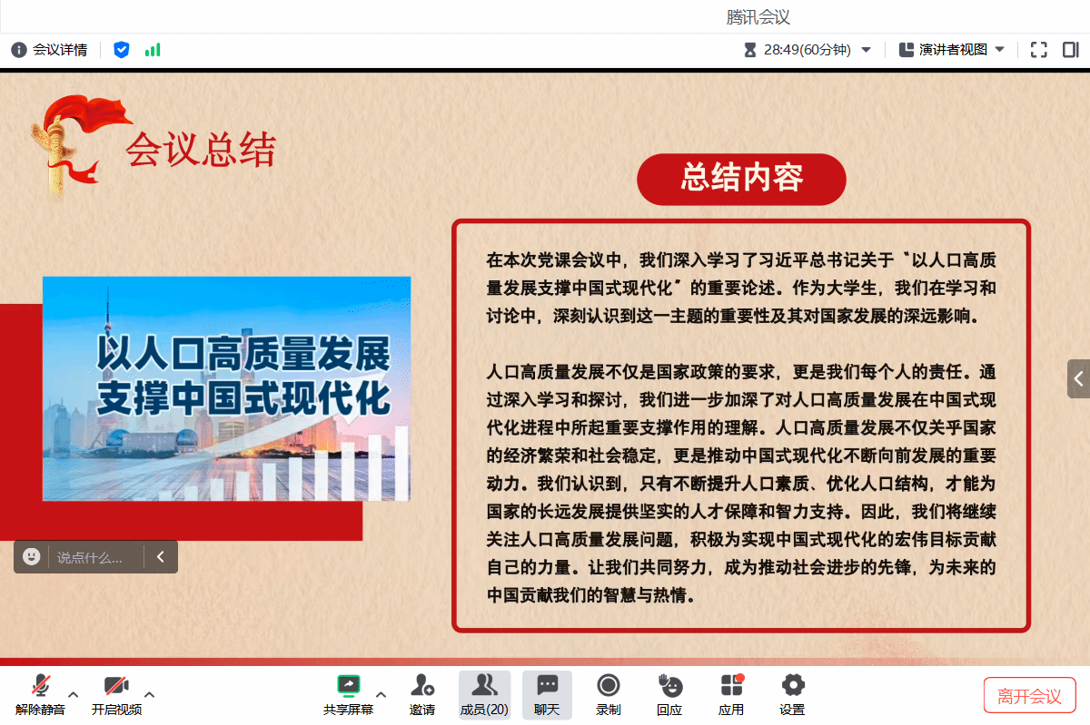 12月27日,威廉希尔学生党支部第一党小组开展以“走人口高质量之路,助力中国式现代化”为主题的党小组会议,本次会议由第一党小组罗燕青主持。
