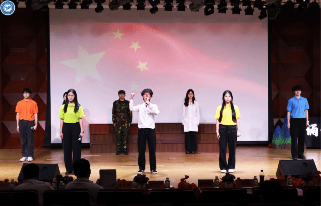 他们时而如惊雷破空,吟诵“参军入伍,报效祖国”的意气风发;时而似春潮涌动,诉说“与祖国共奋进,与时代系进步,与农村共发展”的赤子情怀。声浪与光影交织间,百年青年的精神图谱在舞台上徐徐展开,最终他们拳拳宣誓“道阻且长,吾将上下而求索,未来可期,奋斗不负新时代”。