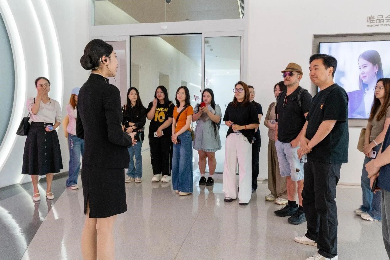 在唯品会负责人陪同下,师生团队开启了一场干货满满的企业探索之旅。他们深入企业核心业务板块,参观供应链智能管理平台、现代化仓储物流体系和大数据运营中心,直观感受电商行业的高效运作模式。在数字化创新应用体验区,AI 智能换装、AI 美妆等前沿技术的展示,让师生们亲眼见证人工智能如何重塑零售业态,深刻认识到科技创新对商业运营的强大驱动力。