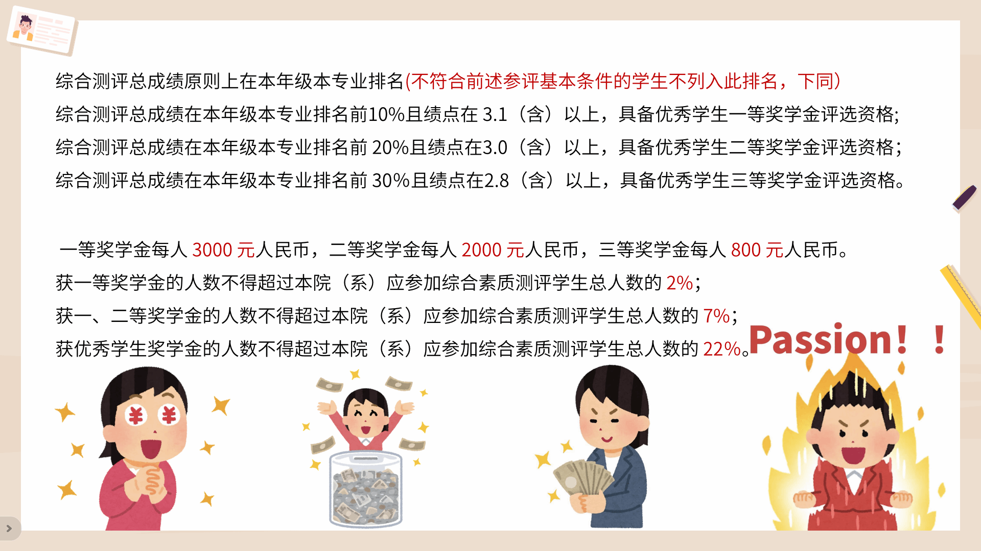 会议详细解读了学校奖学金的评定标准、申请条件等。旨在激励同学们刻苦学习、全面发展,争取优异的成绩和荣誉,同时也确保评奖评优工作的公开、公平、公正。随后,钟湘老师鼓励同学们不仅要关注学业成绩,也要积极参与学校活动、社会实践、志愿服务等活动,以提升综合素质。