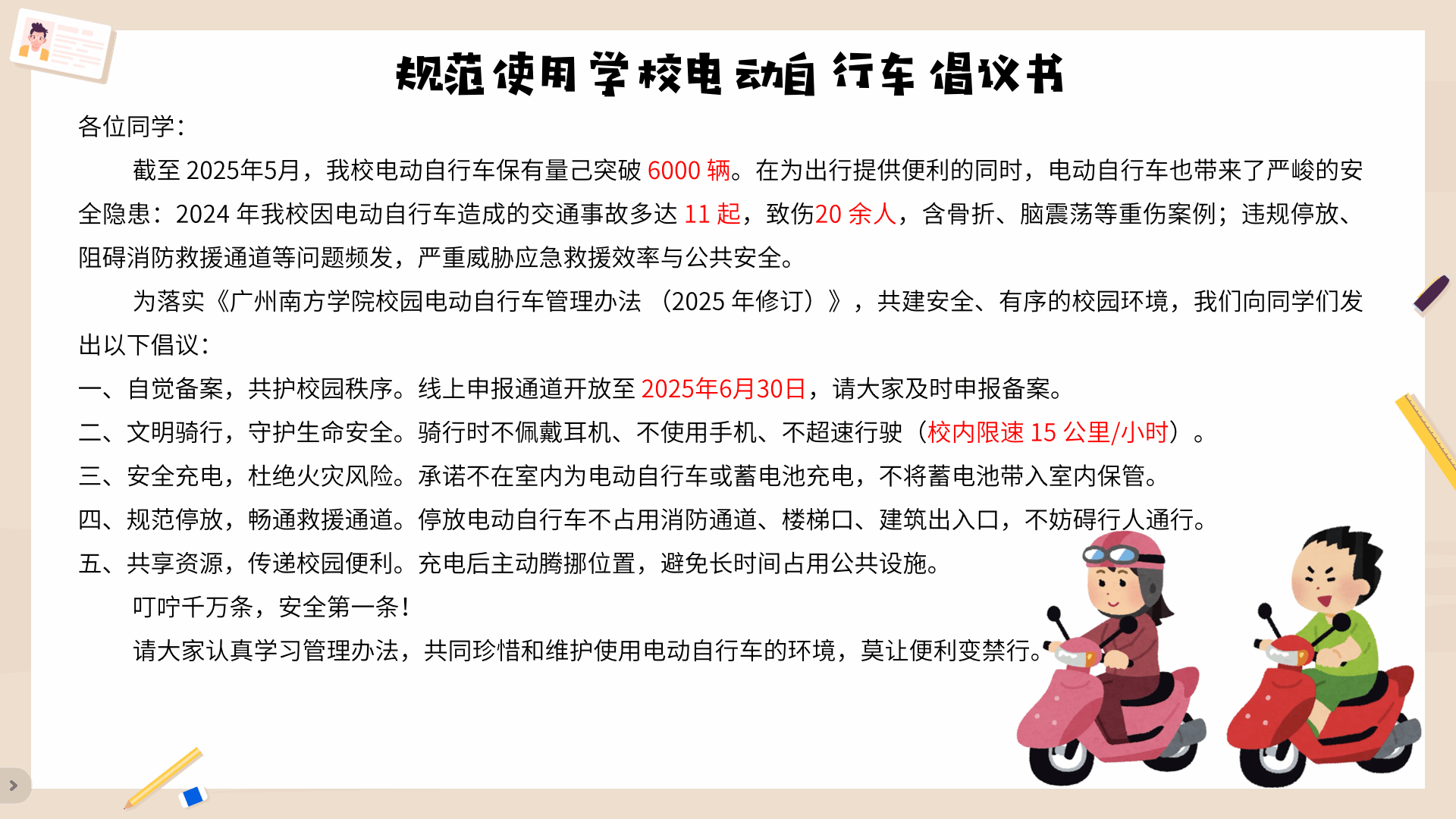 校园安全无小事。会议强调了近期校园内需注意的各项安全事项,针对校园电动自行车数量增多带来安全隐患,会议重点重申了“规范使用学校电动自行车倡议书”,钟湘老师提醒大家在规定时间内给电动自行车实名登记上牌,遵守校园交通规则限速行驶等要求,共同维护安全、有序、和谐的校园环境。