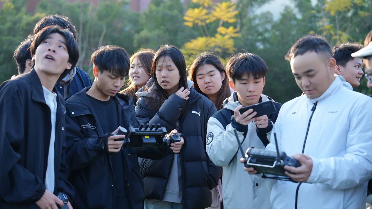 为了让学生们更加深入地了解大疆设备的实际应用,活动还特别安排了户外实拍环节。在东操场上,悟3无人机腾空而起,以独特的视角捕捉着校园的美丽风光。学生们纷纷上手操作,亲自感受了大疆设备的稳定与精准,并且通过调整无人机的飞行高度和角度,看到了校园内不同角度的美景;通过稳定器的辅助,拍摄出了更加流畅、稳定的画面。这一环节不仅让学生们更加直观地了解了产品性能,还激发了他们对影像创作的热情与好奇心。