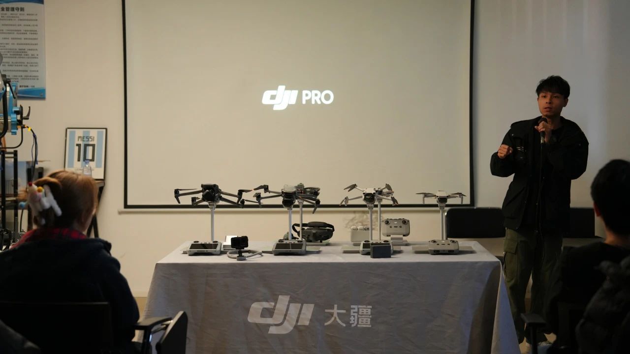活动现场,大疆专业影像(DJI PRO)的罗琦老师为威廉希尔学生带来了精彩的分享。他详细介绍了大疆的各类产品,从Pocket3这样的便携式设备,到多种不同型号的无人机,从小巧轻便的入门级产品到专业级的悟3无人机、专业电影机如影4D,都一一进行了展示和讲解。罗琦老师还特别强调了无人机在影像创作中的独特优势,如高空视角、灵活操控等,让学生们对无人机拍摄有了更加深入的认识。